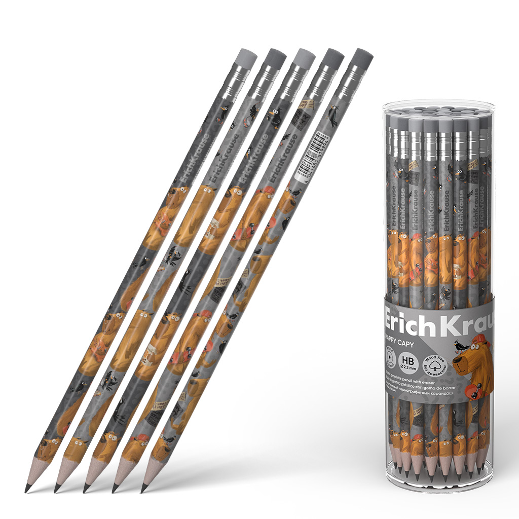 Plastic Graphite Pencil Erichkrause Happy Capy, Round, With Eraser, Hb#61999